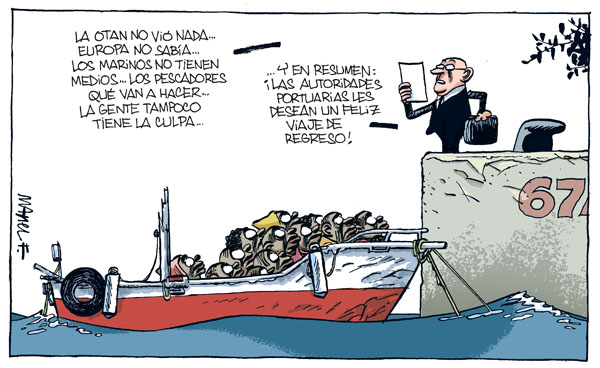 Termino hoy con una viñeta de Manel, tan acertado como acostumbra, que refleja la penosa e indecente actuación en la que barcos militares europeos y de la OTAN dejaron morir en el mar de hambre y sed a 61 inmigrantes en el mes de marzo cuando la embarcación, con la que pretendían llegar a la isla italiana de Lampedusa desde Libia, quedó a la deriva por el Mediterráneo.